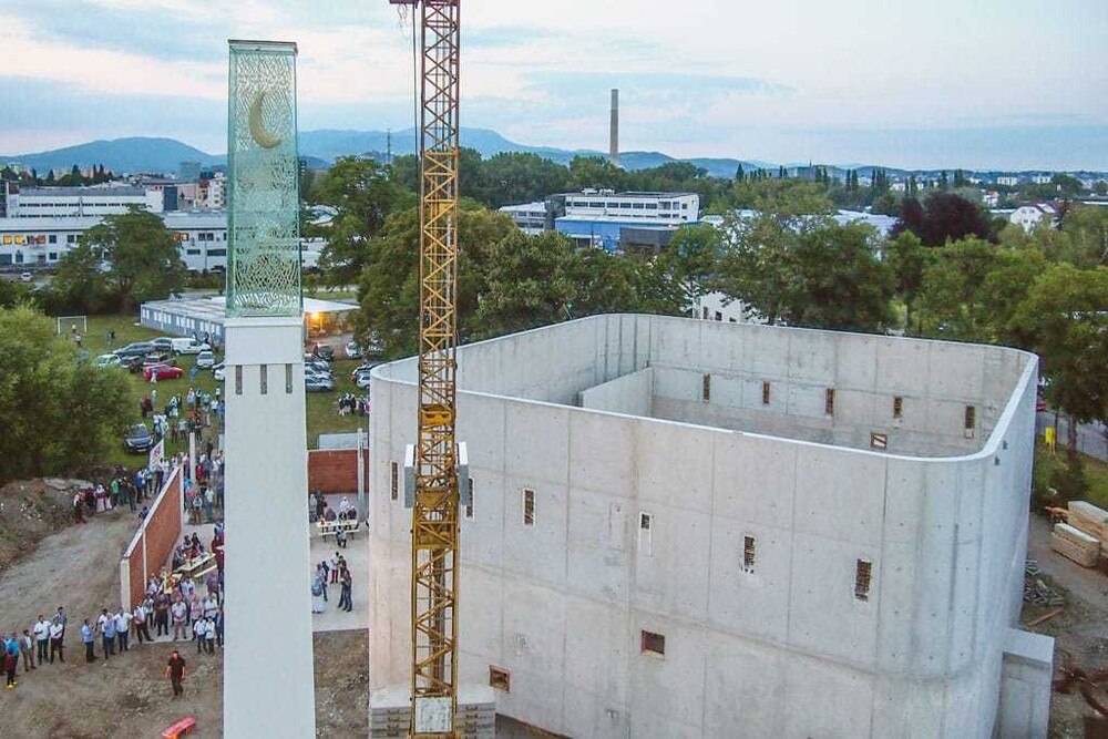 Der zentrale Gemeinschafts- und Versammlungsort wurde als Stahlbetonkonstruktion errichtet, wobei immer nur ein Viertel des Raumes über Eck und über die gesamte Gebäudehöhe von zwölf Metern auf einmal geschalt und betoniert wurde. Die Aussteifung erfolgt über vorgespannte Stahlbetonträger der Deckenkonstruktion, die im Nachhinein mittels Ortbeton eingebracht werden. Die Attika soll rund 2,5 Meter erhöht werden, um die Klima- und Lüftungstechnik am sonst begrünten Flachdach zu verbergen. Außenseitig erhält der Moscheebau eine hinterlüftete Glasfassade, die speziell hierfür mittels eines eigenen Schmelzglasverfahrens, einer thermischen Nachverformung von Flachglas, hergestellt wird. Das so erzeugte, auch gebogene Reliefglas ist auf der Matrizenseite mit einem für die islamische Kunst typischen geometrischen Ornament strukturiert. Die Rückseite der Sicherheitsverglasung wird mit grüner Farbe – die Farbe des Propheten – teilweise auch transluzent beschichtet. Die Befestigung an der Stahlbetonwand erfolgt durch ein patentiertes System, das die sichtbare mechanische Befestigung auf ein Minimum reduziert, gleichzeitig aber das Austauschen jeder einzelnen Scheibe gestattet. Die gesamte Projektentwicklung und -abwicklung kann bis zum jetzigen Zeitpunkt als mustergültig hervorgehoben werden. Die zeitliche Verzögerung bei der Bauabwicklung – die Grundsteinlegung fand bereits im Mai 2012 statt, und die Fertigstellung der Moschee (3,5 Millionen Euro Baukosten) wird voraussichtlich im Lauf des Jahres 2015 erfolgen – liegt daran, dass der Baufortschritt nach Maßgabe der Finanzierung und ausschließlich über Spendengelder erfolgt.